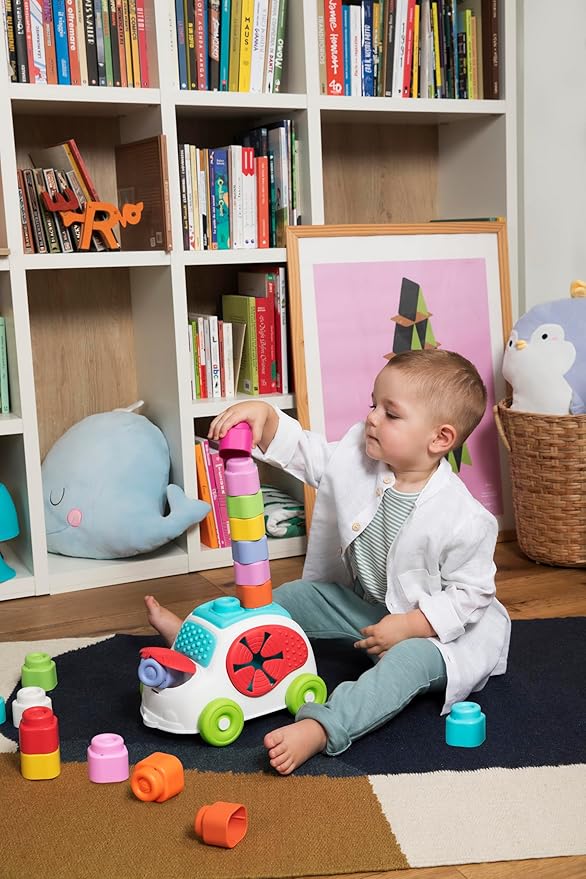 - With figure and 8 soft building blocks: the soft building blocks can be stacked, pushed or stuck through the car - the included figure provides additional play value and promotes creative play.